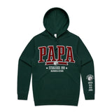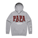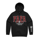 Custom Printed Hoodie for Dad - With Custom Date, City + names on sleeve - PAPA COLLEGE RED STYLE